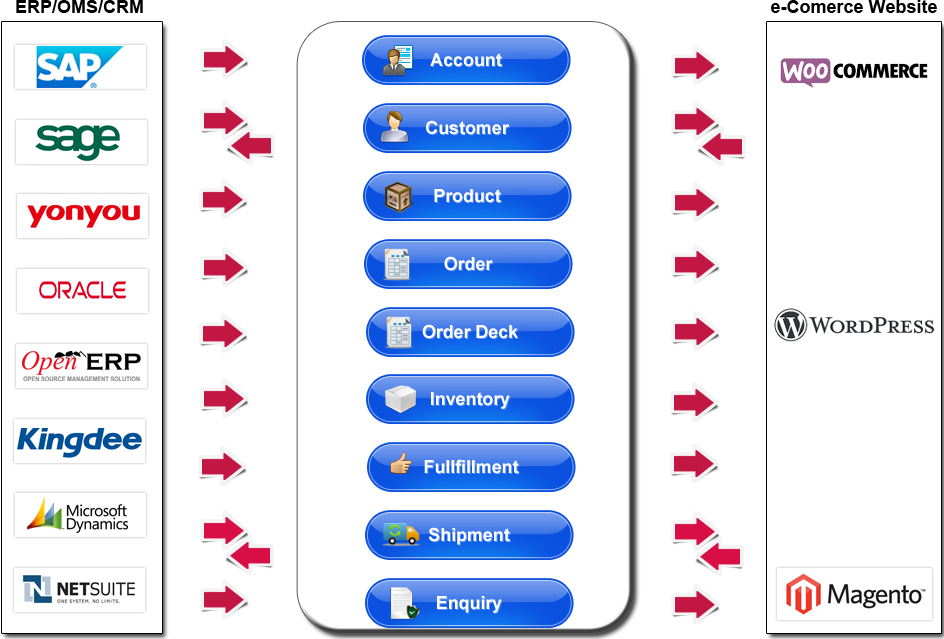 我们已为多种 ERP、POS 及 CRM 系统提供与 Magento 等电商平台的集成解决方案,例如: