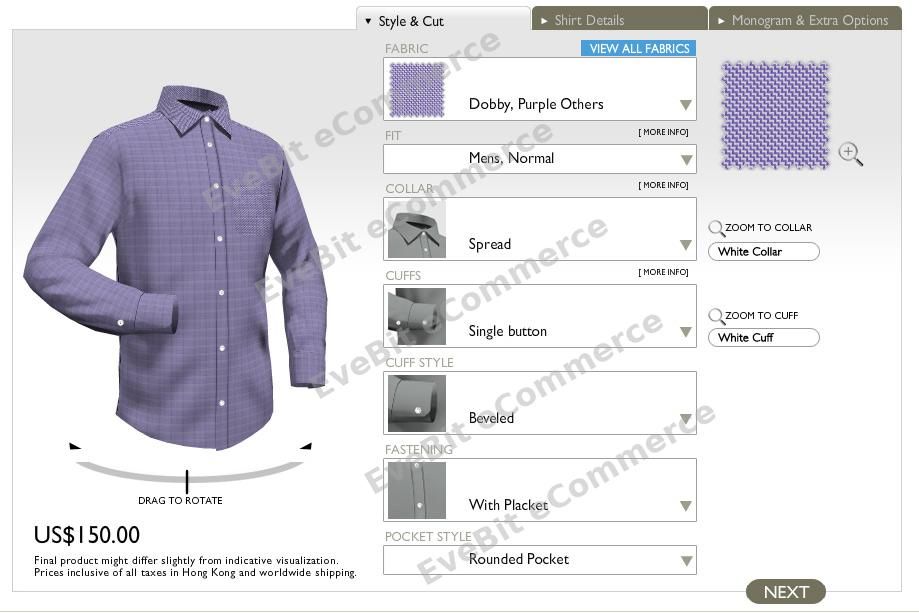 该项目基于 Magento 开发,并创新性地整合了当时先进的 3D Flash Engine,实现在线衬衫定制的可视化体验。用户可自由选择面料、版型、领型、袖口等个性化配置,并通过3D界面实时预览成衣效果,大幅提升用户参与感与转化率。这种“3D可视化 + 电商系统”的深度融合,在当时电商行业中具有极强的创新性。